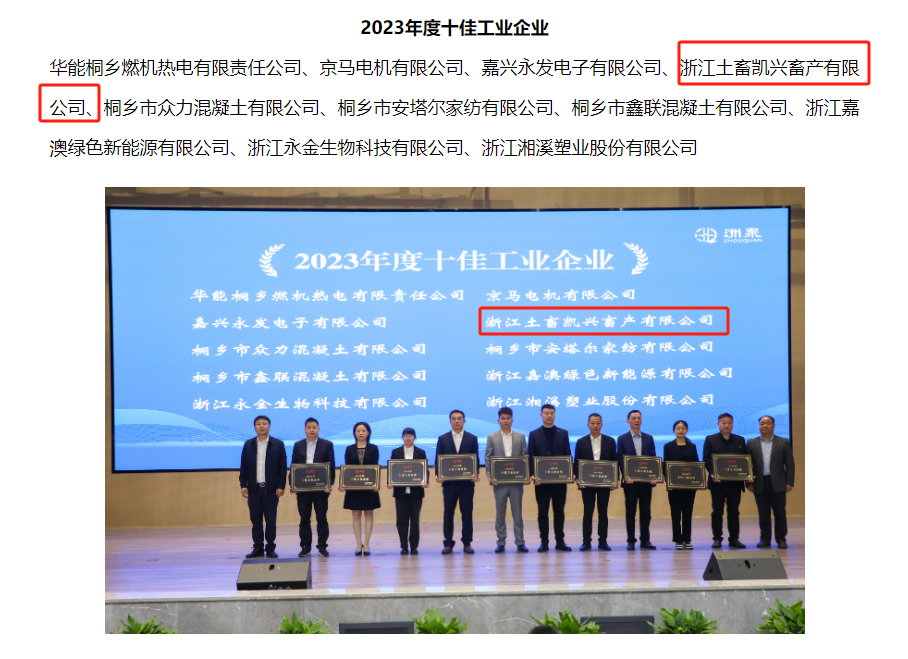 喜報!浙江土畜凱興畜產有限公司喜獲洲泉鎮2023年度“十佳工業企業”和“優秀農業龍頭企業”雙榮譽