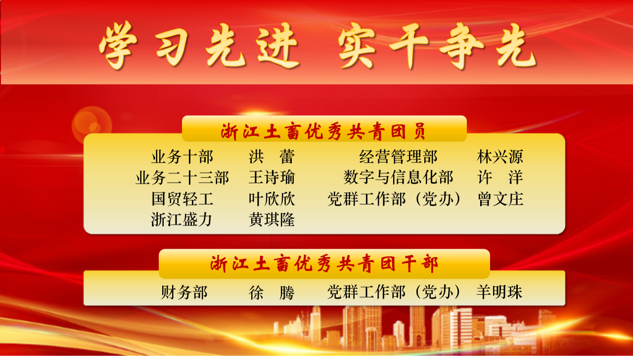 為表彰先進、樹立榜樣,激勵公司各級團組織和廣大團員青年比學趕超、奮勇爭先,浙江土畜團委決定,對2024年度優秀共青團員、優秀共青團干部予以表彰。希望各級團組織和團員青年,要以受表彰的先進典型為榜樣,學習他們對黨忠誠、積極向上的政治本色,學習他們敢挑重擔、沖鋒在前的硬核擔當,學習他們立足一線、創先爭優的務實作風,學習他們遵規守紀、積極作為的職業操守。要大力傳承和發揚土畜人“實干”的優良傳統,在深度融入共同富裕、開放強省等重大戰略中加快打造“國際供應鏈服務價值創造者”,貢獻更多青春力量。