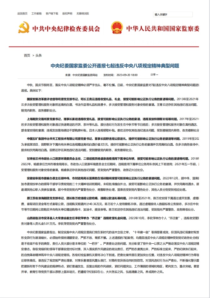 《中央紀委國家監委公開通報七起違反中央八項規定精神典型問題》